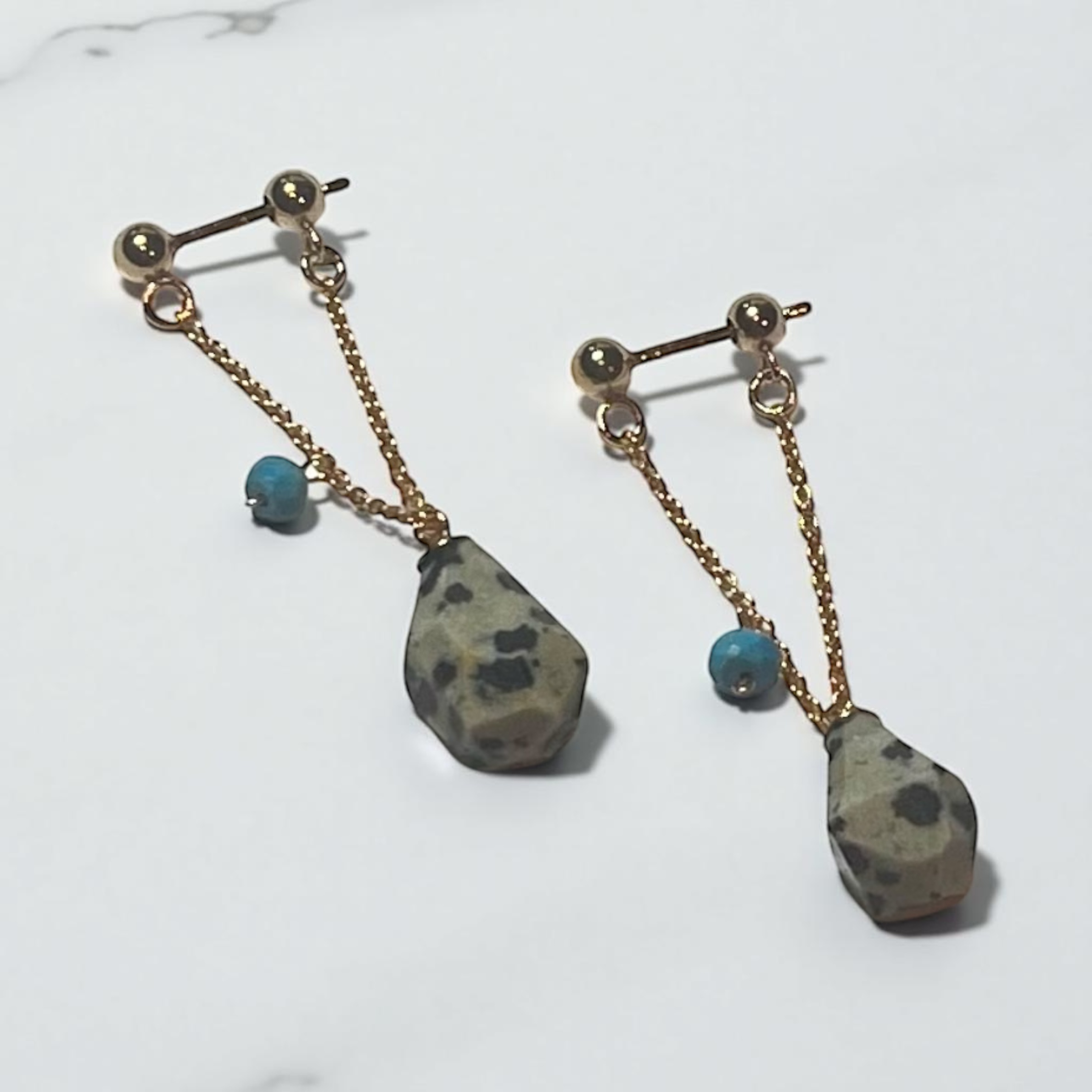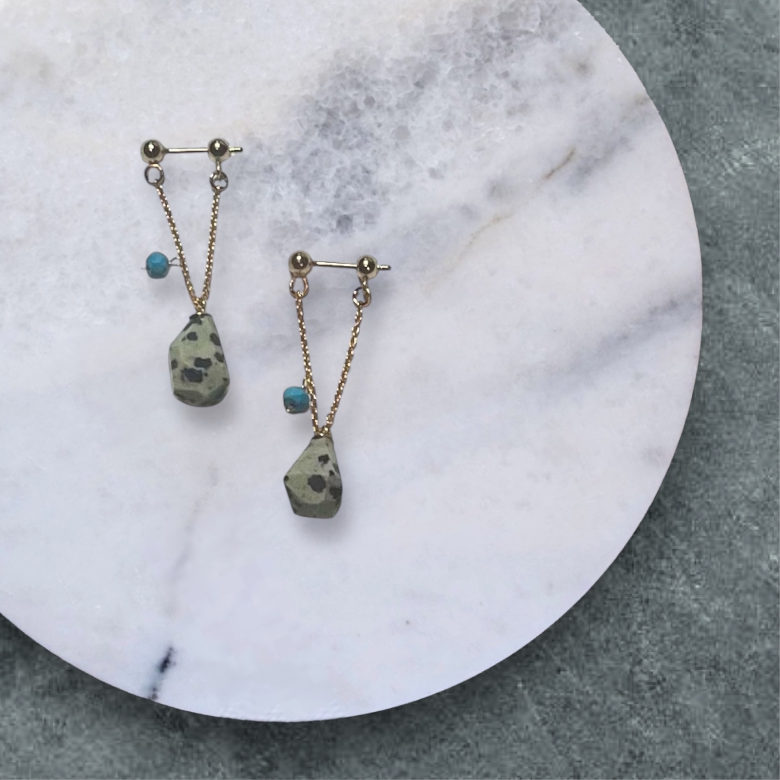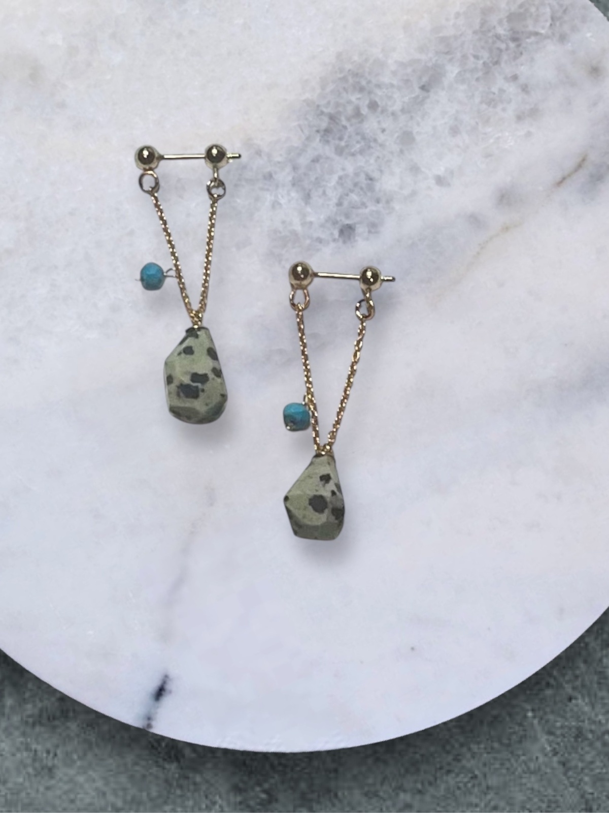 このピアスは、ジャスパーとターコイズの絶妙なコントラストが目を引きます。ジャスパーは、穏やかなエネルギーとバランスをもたらす石として知られ、ターコイズは幸運の象徴とも言われています。これらの天然石が組み合わさることで、見た目だけでなく心の安らぎも感じられるでしょう。