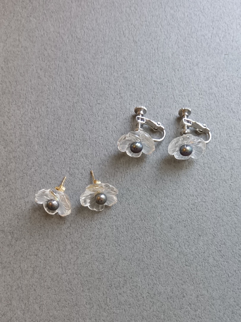 水晶と淡水パールをつかって、お花をイメージした可愛いピアス・イヤリングができました。